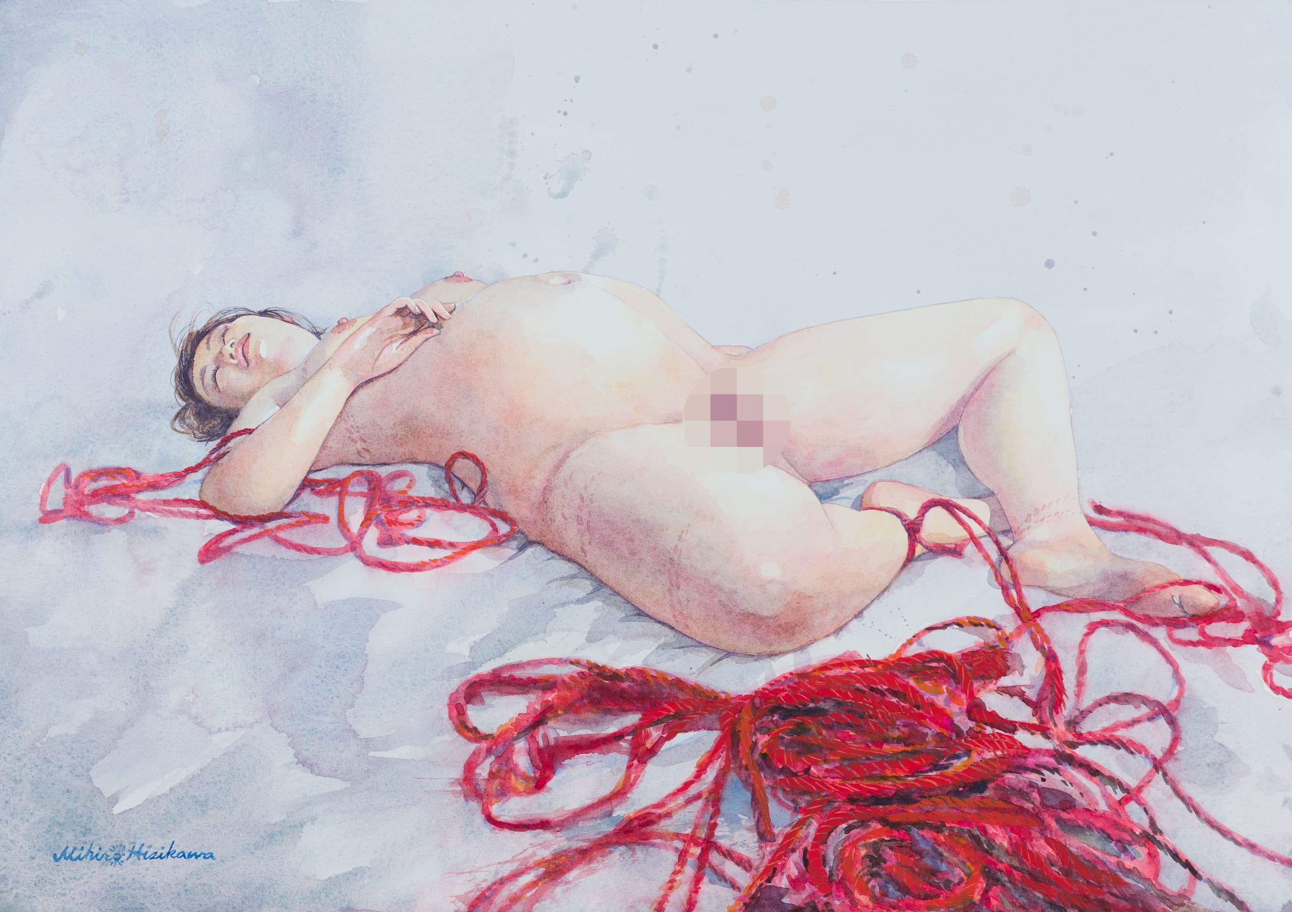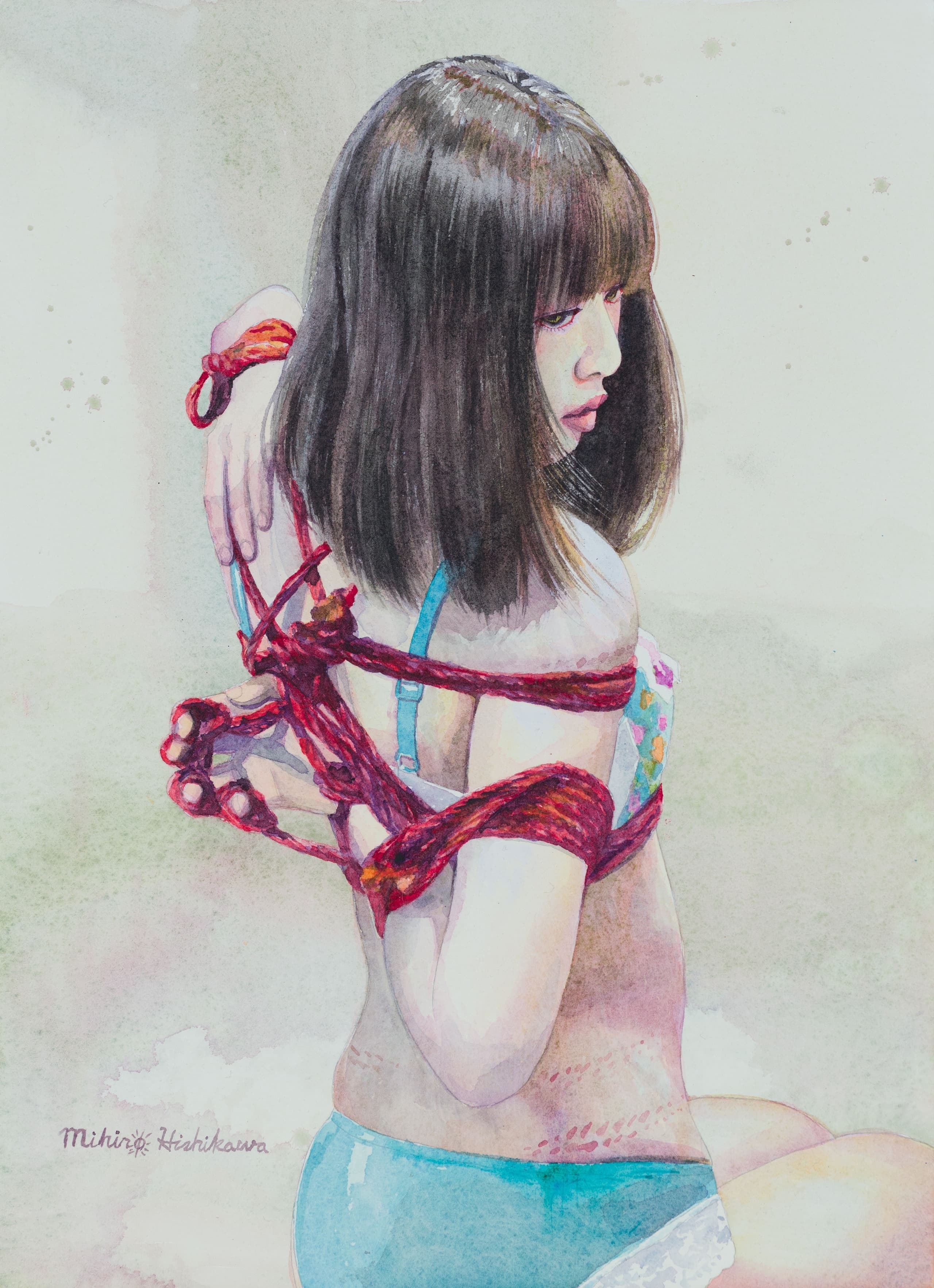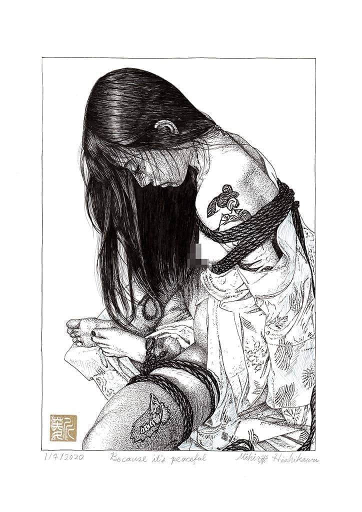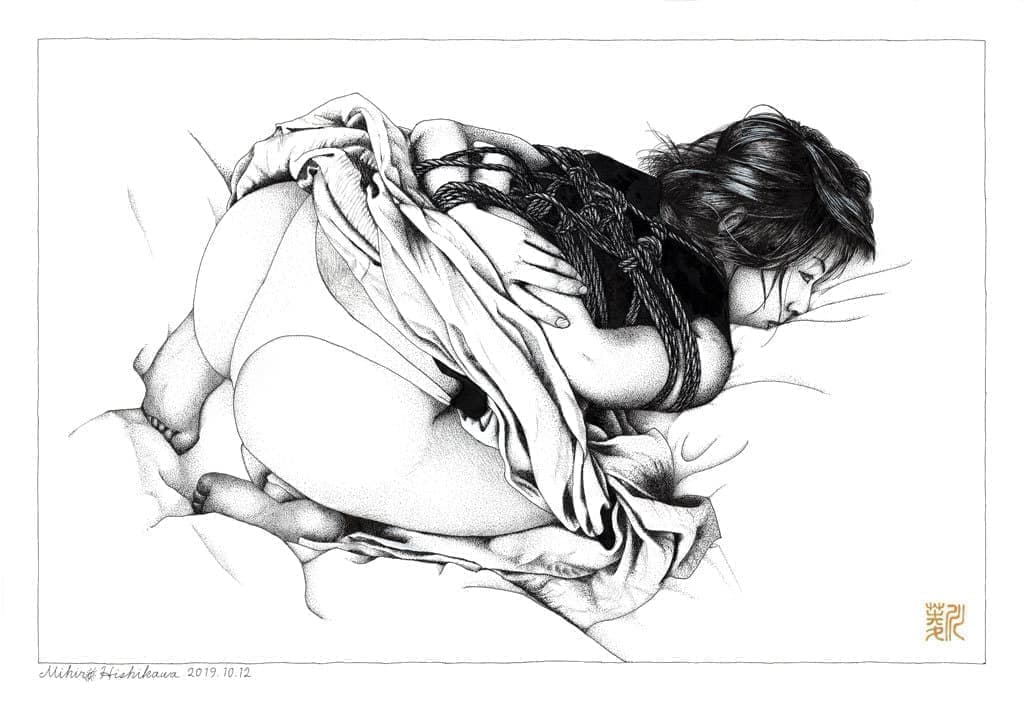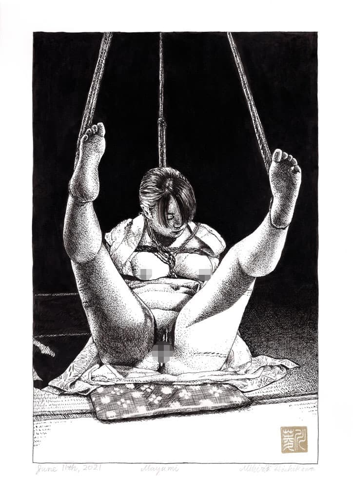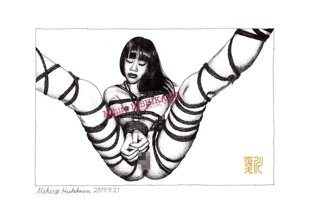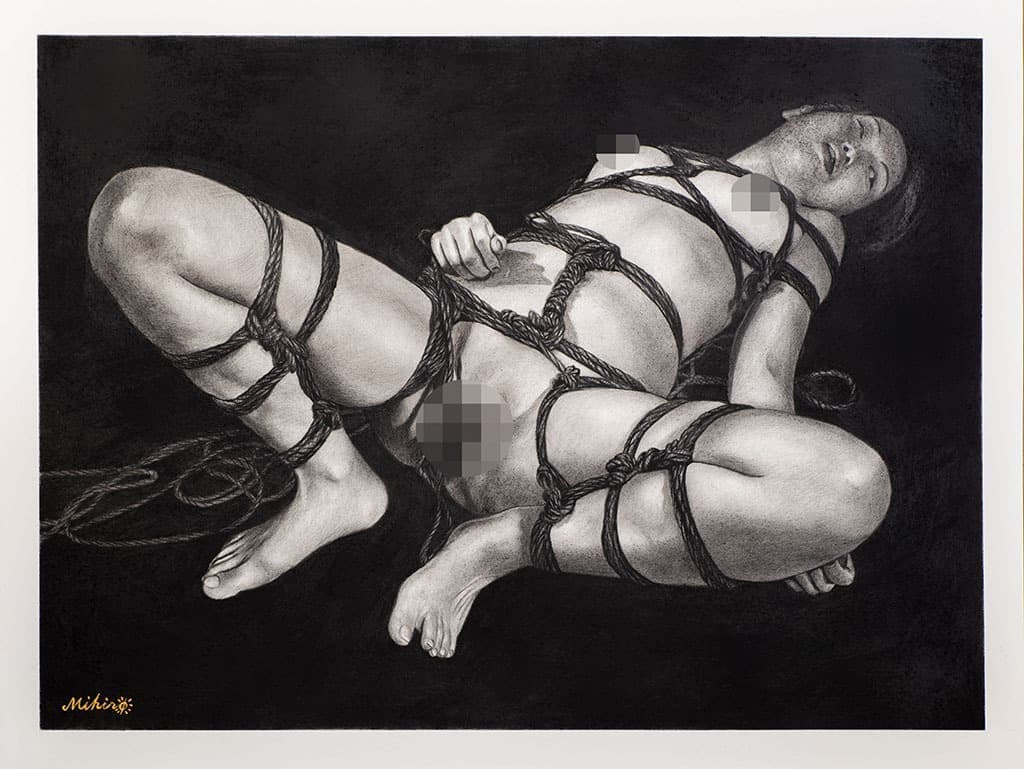 彼は自分でモデルを縛り、モデルの写真を撮り、その写真を元にモデルとの秘密の世界を描いている。女性器はチャームポイントとして描かれている。そしてその絵は妖しくて繊細である。